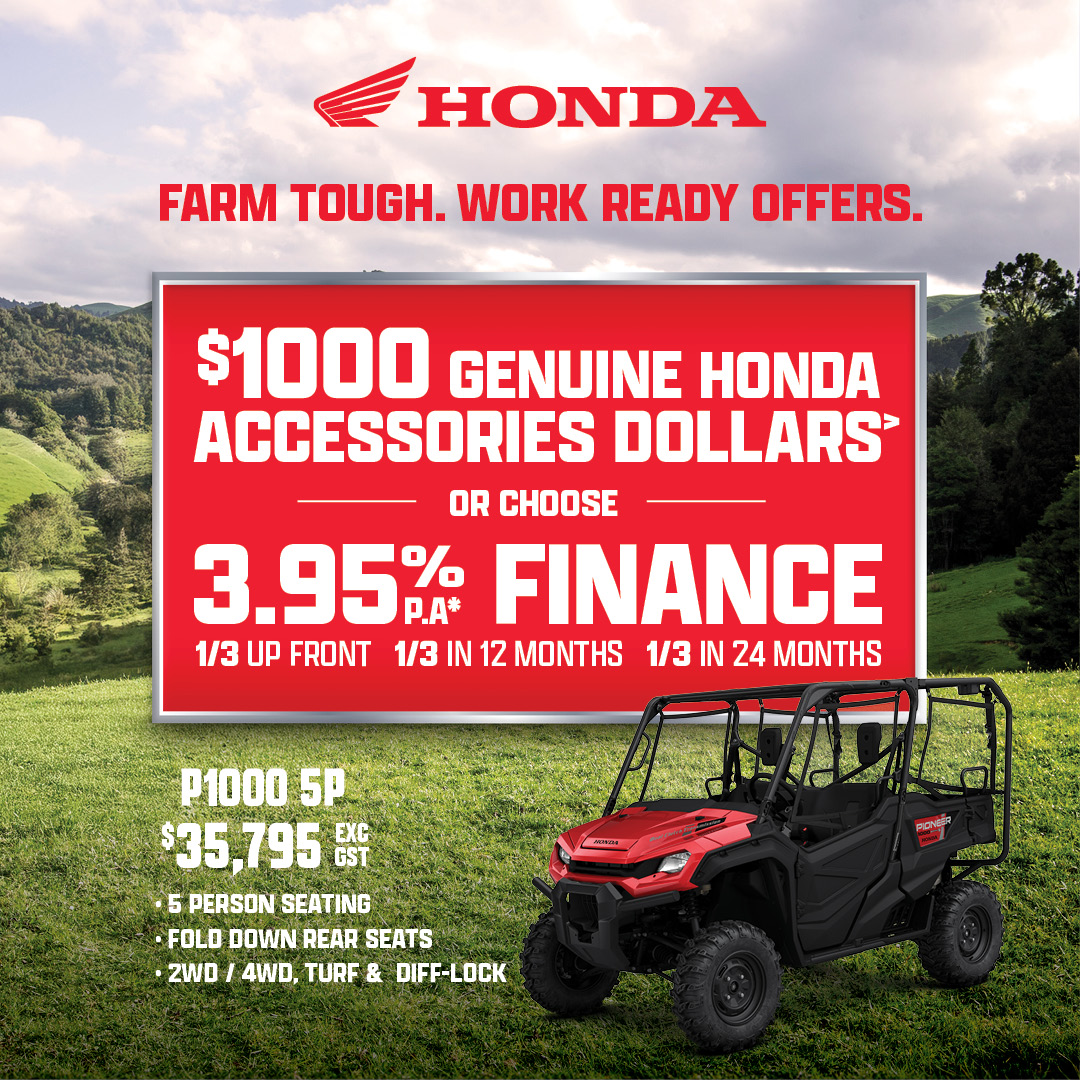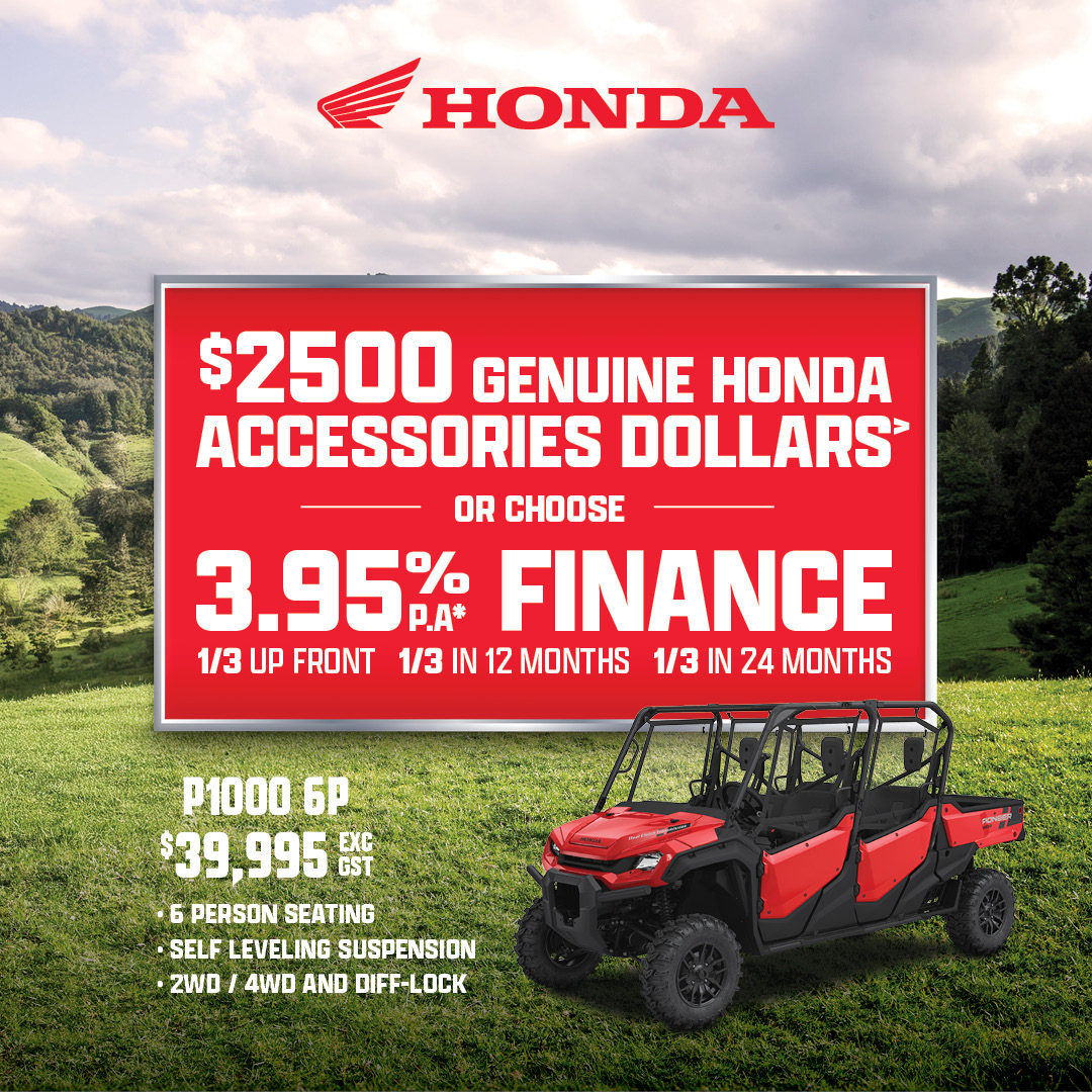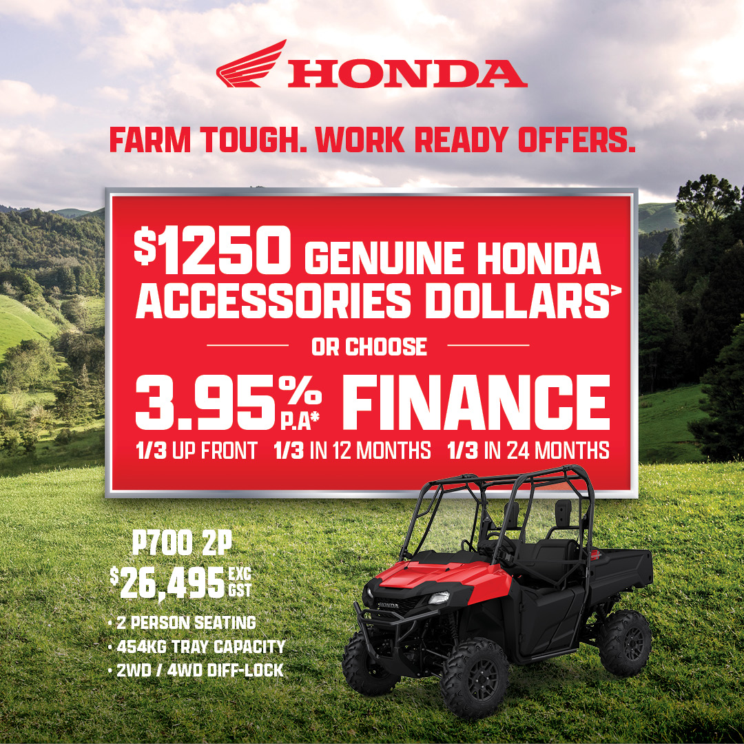 This Honda Rider Finance offer is based on a 3.95% p.a. interest rate fixed for the 24-month term of the loan. This offer applies to eligible new Honda motorbike models only (XR190, XR150, XRM125, CT125F, TRX250TM1, TRX420TM1, TRX420FM1, TRX420FM2, TRX420FA2, TRX420FA6, TRX520FM1, TRX520FM2, TRX520FM6, TRX520FA6, TRX520FA7, TRX700FA5, Pioneer 520, Pioneer 700-2P, Pioneer 700-4P, Pioneer 1000-3P, Pioneer 1000-5P and Pioneer 1000-6P), financed on or before 27 March 2026 (or while stocks last). An up-front deposit of one-third (1/3) of the RRP is required plus the cost of any accessories fitted, and the fees detailed below. Two further payments of 1/3 of the RRP are to be paid on the one-year loan anniversary and the two-year loan anniversary. A $130 UDC establishment fee, $10.35 PPSR fee, monthly maintenance fee of $2 and dealer origination fee applies (your Honda motorbike dealer can tell you their applicable fee). This offer is available at participating Honda motorbike dealerships only and is not available in conjunction with any other finance offer, promotion, or discount. Honda Rider Finance is provided by UDC Finance Limited. Any loan is subject to responsible lending inquiries. UDC’s loan eligibility criteria, fees, terms and conditions apply.